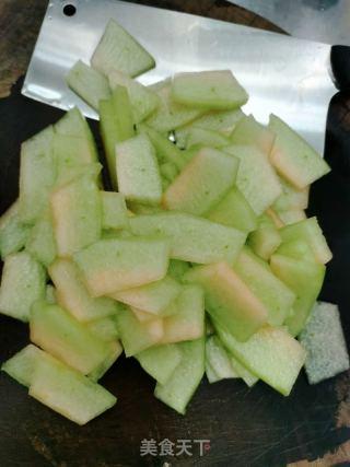 4. 切片:将哈密瓜放在案板上,用刀沿着哈密瓜的长度方向,从中间切开。将切开的哈密瓜放在案板上,用刀沿着哈密瓜的宽度方向,切成薄片。